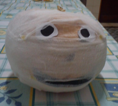 A abóbora-múmia ou abóbora que se partiu toda e foi "enfaixada" ao concurso. Foi copiada descaradamente de alguém genial (não me lembro quem) que fez e "pinou" no Pinterest.