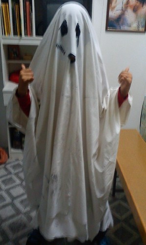 Tentei que ele levasse uma corda ao pescoço (estilo fantasma enforcado) mas ele não consentiu e acho que se assustou um bocadinho... Pronto, se calhar entusiasmei-me e entrei no espírito...:)